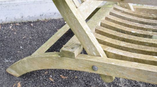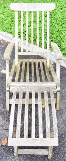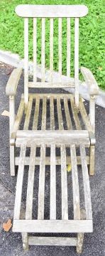Pair of teak reclining garden steamer chairs with cushions, length 160cm