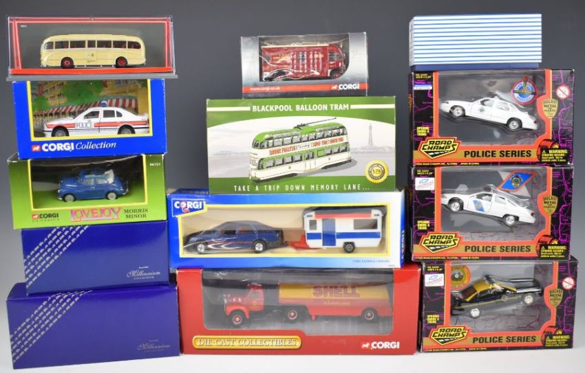 A collection of diecast model cars, trucks and lorries manufacturers include Corgi, Dinky, Road Champs and Atlas Editions, all in original boxes.