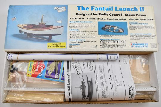 The Fantail Launch II steam powered radio controlled wooden boat kit and Model VI Steam Engine, both by Midwest Products, in original boxes with instructions, length 48cm.