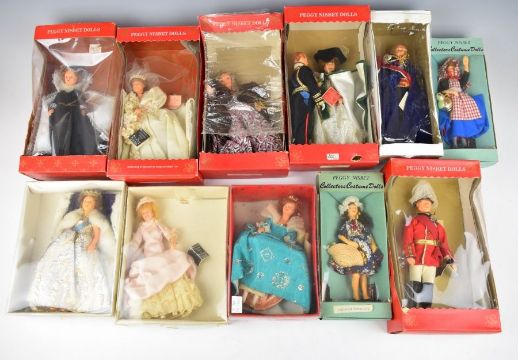 A collection of Peggy Nisbet costume and portrait dolls to include Lady Diana, Mary Queen of Scots, King Edward VIII, Elizabeth II and HRH Prince Phillip, many in original boxes.