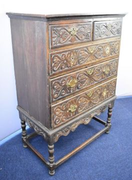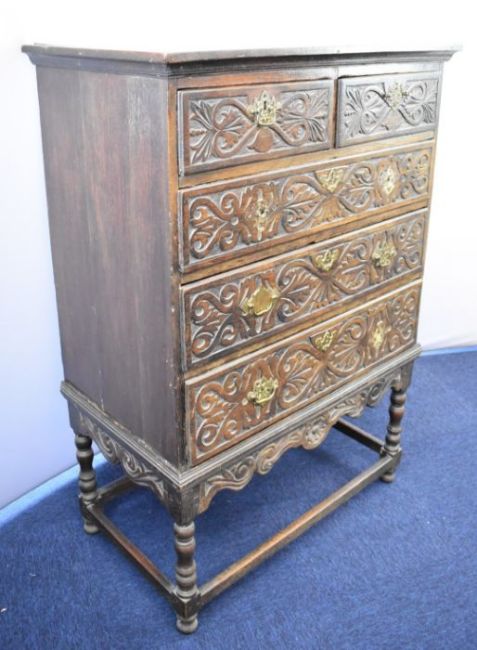 18th /19thC carved oak chest on stand of two over three graduated drawers, W95 x D52 x H135cm