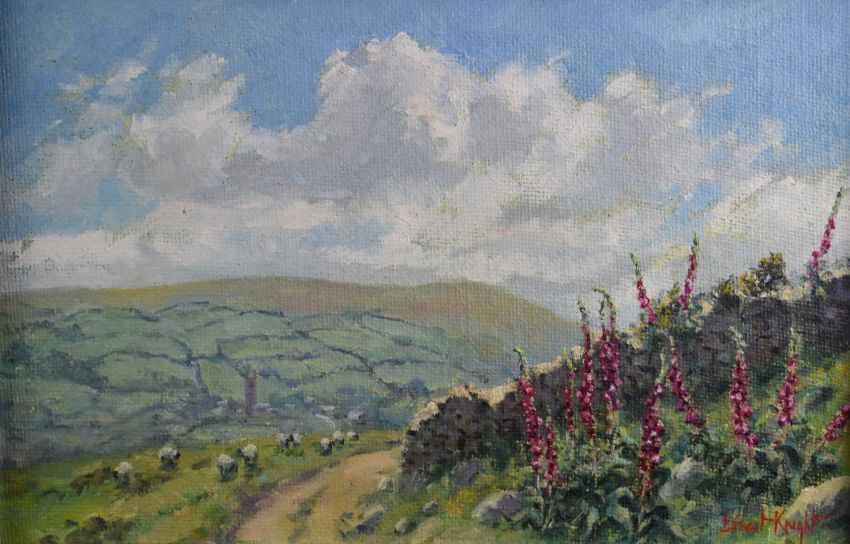 Ernest Knight (1915-1995) two oil on board Dartmoor landscapes comprising Dartmoor with ponies and Foxgloves at Widecombe, both signed lower right and titled verso, larger 23.5 x 37cm, in gilt frames