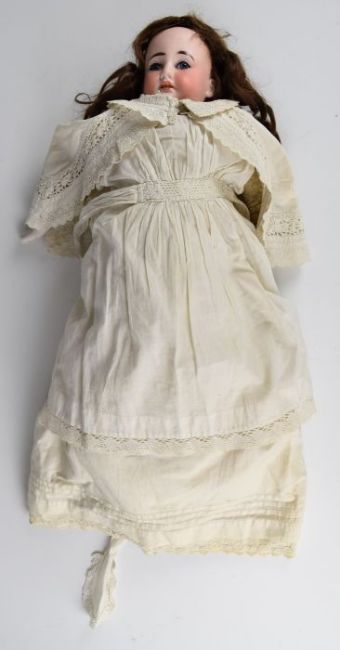 Late Victorian or Edwardian bisque headed doll with open mouth, tinted cheeks, fixed blue eyes, stuffed leather body and composite arms.