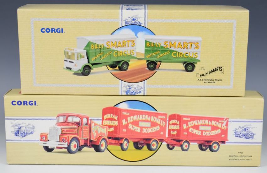 Five Corgi diecast model lorries with circus or funfair themes, to include Scammel Highwayman Generator with closed pole trailer & Dodgem Trailer set 15901 and AEC Mercury Truck & Trailer Billy Smart 97891, all in original boxes.