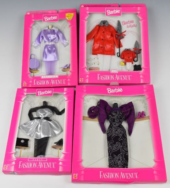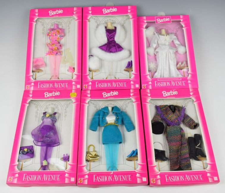 Thirty-five Mattel Barbie clothing and accessory sets, all in original packaging.