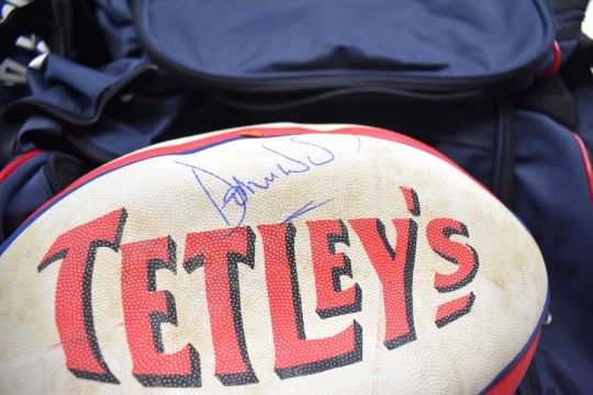 England Rugby kit bag with four Gilbert / Adidas match balls, some signed, signed England shirt, waterproof hoodie etc
