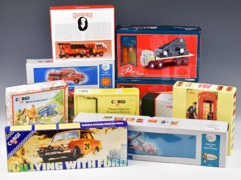 Ten Corgi Toys diecast model trucks, lorries and cars in limited edition boxed sets to include Mack B Series Lowboy & Luffing Shovel 53503 and ERF V8 Wheel Platform Lorry With Generator Load 09804, all in original boxes.
