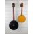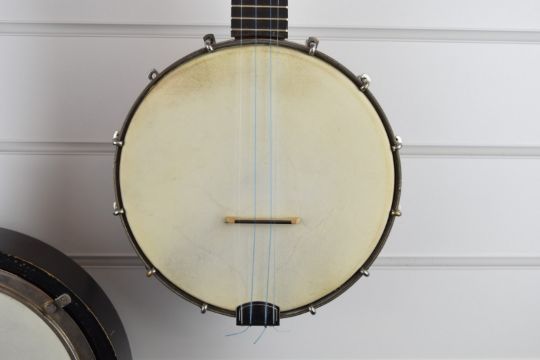 Mid-20thC four string banjo with mother of pearl heart shaped inlay, length 54cm and a larger four string banjo, length 73cm, both with cases