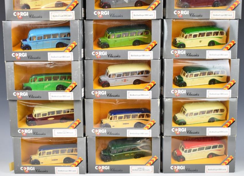 Twenty-six Corgi Classics diecast model Bedford type OB coaches or buses, liveries include Wallace Arnold, Royal Blue, Greenslades, East Yorkshire, Eastern National, Grey Cars, Crossville, Southdown and British Railways, all in original boxes.