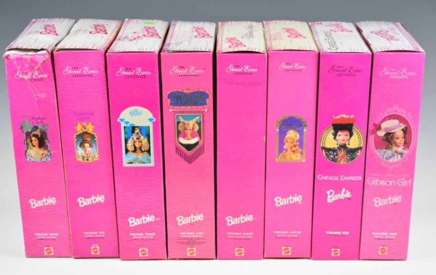 Eight Mattel Barbie dolls 'The Great Eras Collection' to include Southern Belle 11478, Gibson Girl 3702, Victorian Lady 14900 and Elizabethan Queen 12792, all in original boxes.