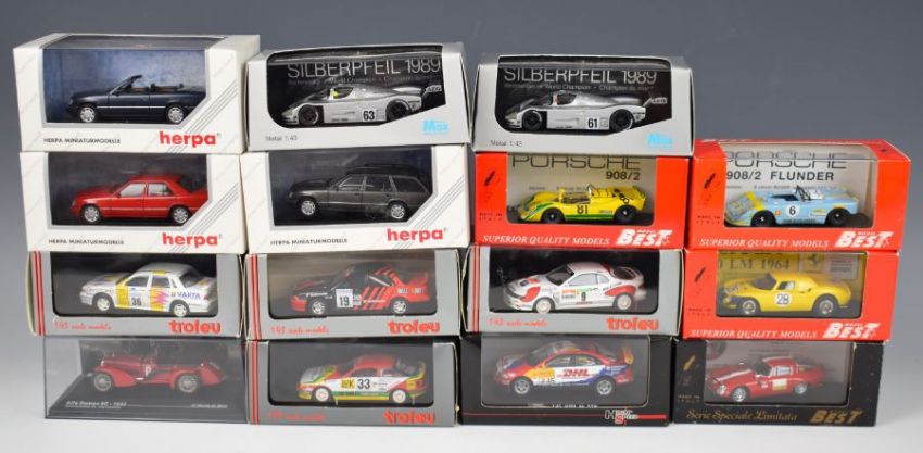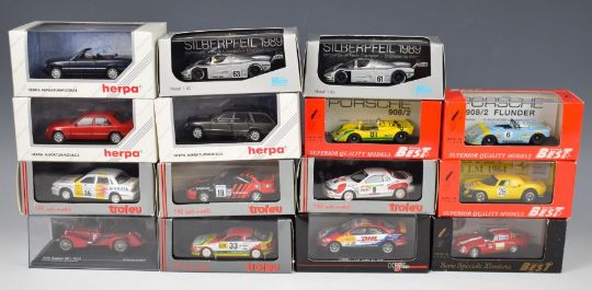 Eighteen diecast model rally and sports cars to include Herpa, Model Best, Trofeu, Models Max and High Speed, all in original plastic display boxes.
