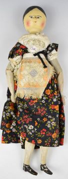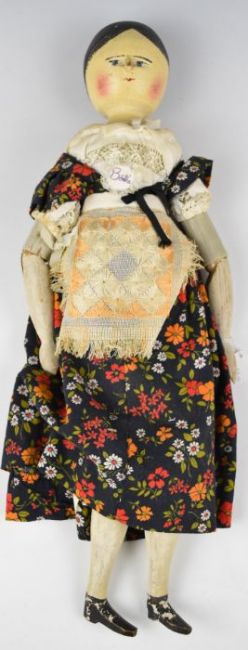 Victorian wooden folk art possibly German Grodnertal or similar style 'wooden top' doll with carved painted features and articulated limbs, height 53cm.