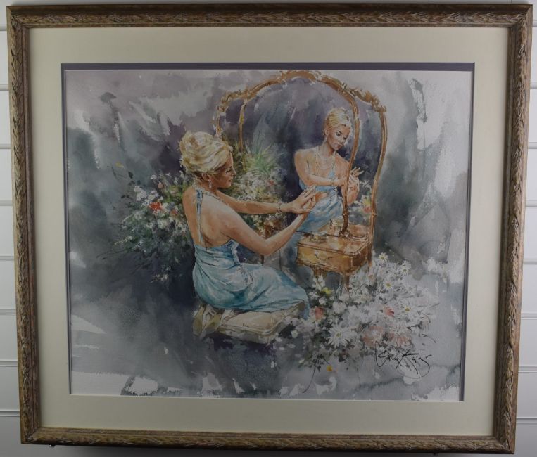 Gordon King (1939-2022) watercolour 'That Special Ring', woman at a dressing table admiring a ring on her finger, signed lower right and titled to label verso, 54.5 x 66cm, in gilt frame, together with a signed copy of the book Gordon King drawn to life
