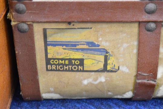 Early to mid 20thC novelty miniature leather bound travelling trunk or workbox with railway labels and lift out tray, length 36cm, and a leather G.Morgan-Jones Tetbury Gloucestershire small suitcase, length 38cm