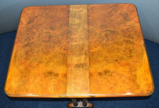 Burr walnut Sutherland table raised on mahogany base and brass castors, 75 x 94 when extended x H72cm