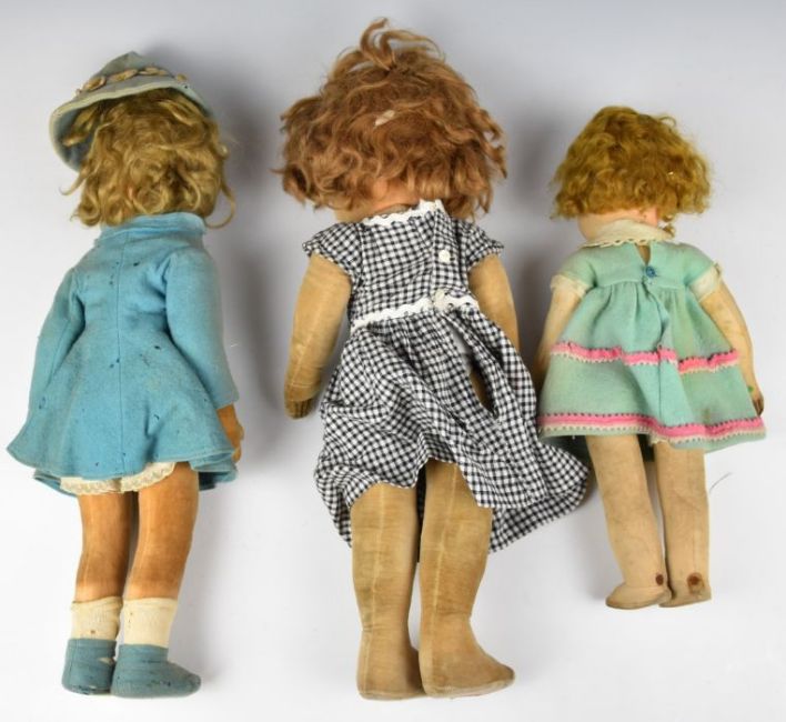 Three Chad Valley or similar felt covered dolls to include a Bambina doll in a black and white chequered dress, tallest 46cm.