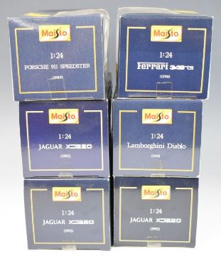 Six Maisto 1:24 scale diecast model cars to include Lamborghini Diablo 1990, Ferrari 348ts 1990 and Jaguar XJ220 1992, all in original boxes.