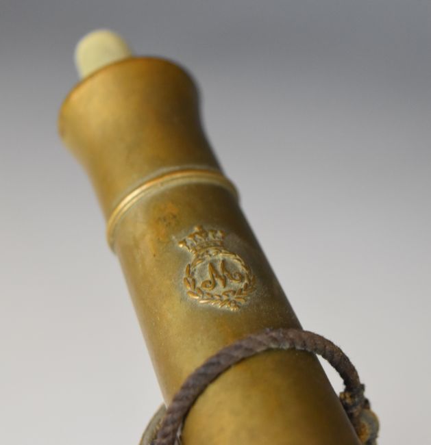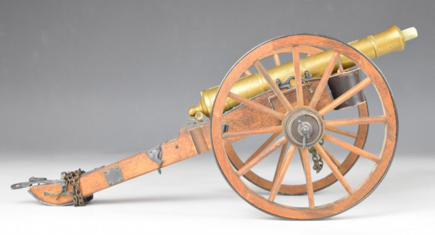 Georgian style .380 desk or signalling cannon with 8 inch graduated multi-stage bronze barrel, proof marks, ram-rod and wooden carriage, overall length 38cm PLEASE NOTE THAT A VALID RELEVANT FIREARMS/SHOTGUN CERTIFICATE IS REQUIRED TO HANDLE/PURCHASE THIS ITEM.
