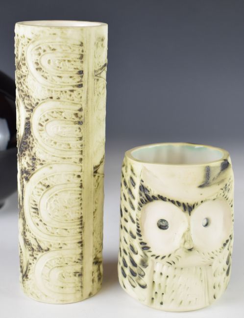 Royal Doulton pedestal flambé vase, Carn Pottery including an owl vase, Victorian figural spill holders, tallest 25cm