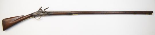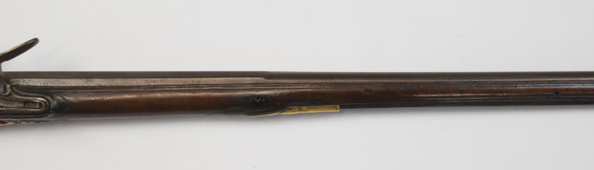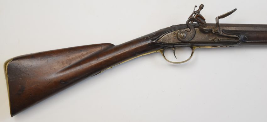 Debonneville of Paris flintlock musket with named and engraved lock, engraved hammer, wire inlaid decoration to the wrist, brass trigger guard, butt plate and mounts, carved railed stock, brass tipped wooden ram-rod and 43 inch part octagonal smooth bored barrel, overall length 151cm.
