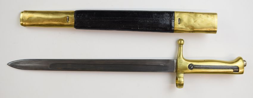 Italian brass hilt bayonet to fit 6.5mm 1915 conversions of the vetterli-vitali rifle, with long spring and M91 29cm blade, cross guard stamped KM5780 and scabbard. PLEASE NOTE ALL BLADED ITEMS ARE SUBJECT TO OVER 18 CHECK ON COLLECTION OR DELIVERY