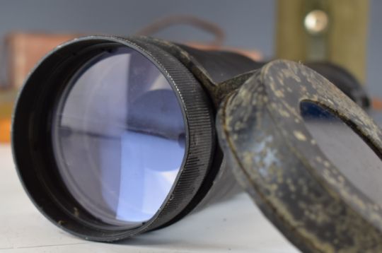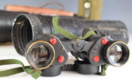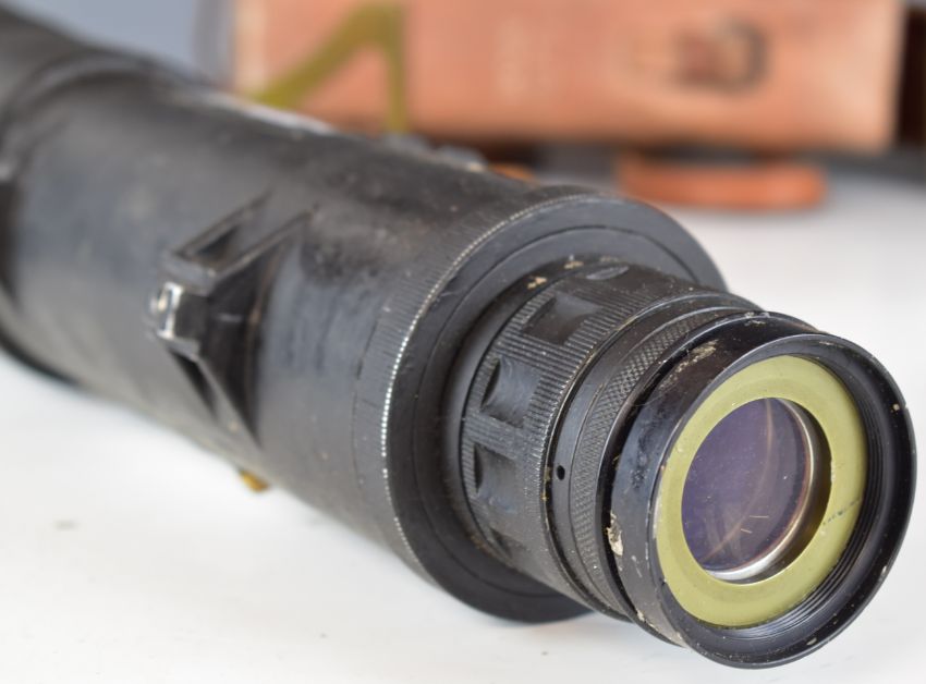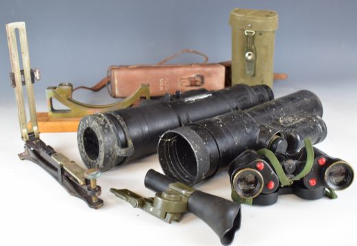 Military sights and binoculars comprising two Weapon Sight II L2A2, FLTD Mk VI in original leather case, mortar clinometer, gun sight or similar in green case and a pair of Kershaw 1945 binoculars