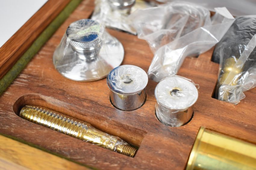 12 bore shotgun cleaning kit with rosewood and brass rods, chrome oil bottles etc, unused in hardwood case and card outer box.