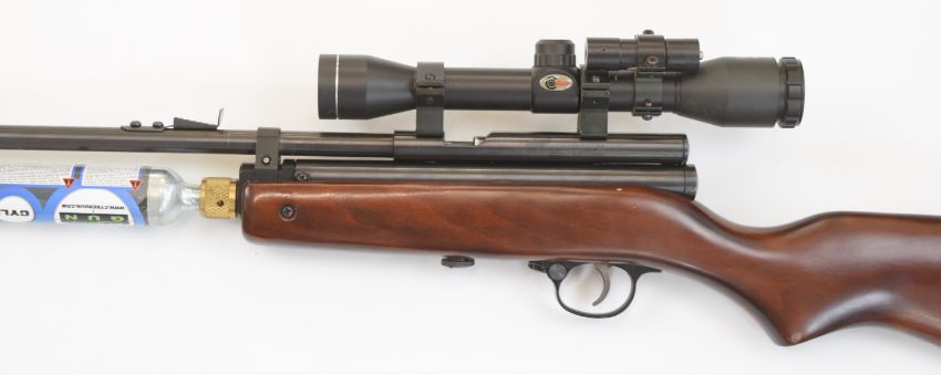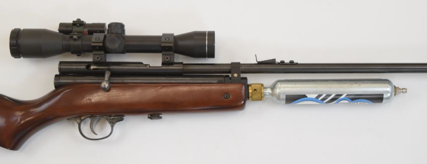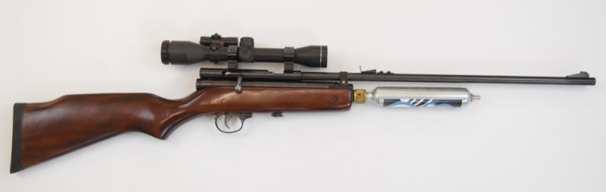 SMK Model XS79 .22 CO2 air rifle with semi-pistol grip, red dot laser sight and SMK 4x32 scope, serial number XS79CC2-88.