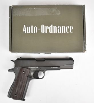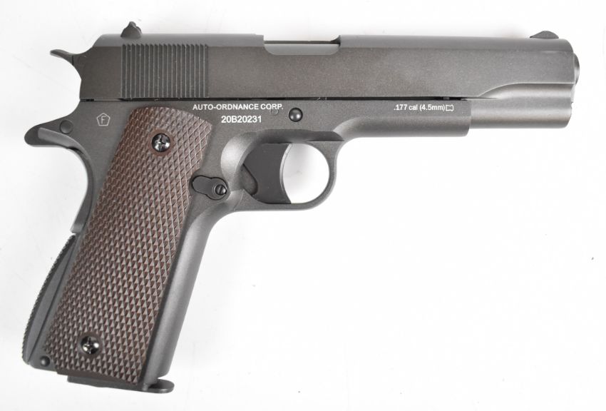 Cybergun Auto-Ordnance 1911 A1 US Army .177 CO2 air pistol with chequered faux wooden grips and multi-shot magazine, serial number 20B20231, in original box with instructions.
