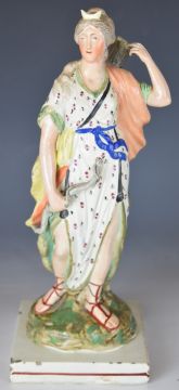 Collection of 19thC English and continental figures including Staffordshire jester, pearlware figure etc, tallest 30cm