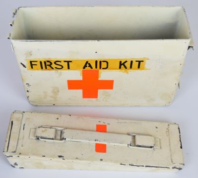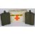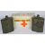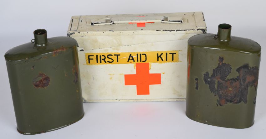 Military first aid kit tin and two metal military water bottles.
