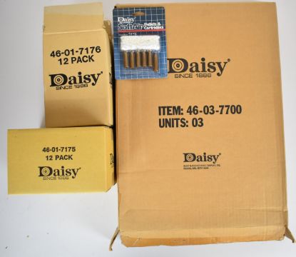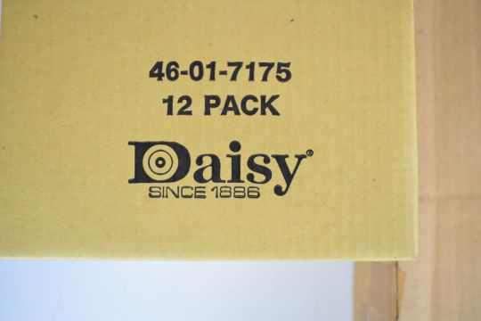 A collection of Daisy airsoft targets, cartridges and pellets, all unused in original packaging and trade boxes.