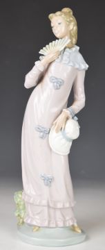 Three Lladro and Nao figures comprising Lladro girl holding book behind her, height 36cm, Lladro lady in shawl and Nao lady with fan