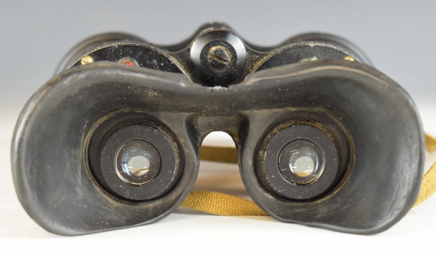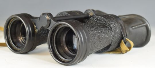 WW2 or similar Air Ministry pair of x5 Bino Prism MK IV binoculars, with broad arrow mark and 6E/383, fitted with rubber eye shields, in original case