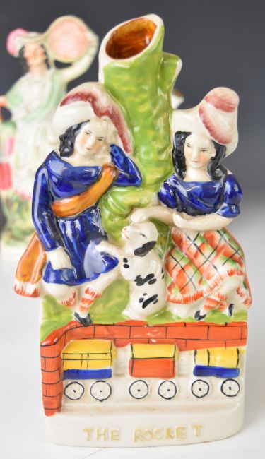 Six 19thC Staffordshire flatback and spill vase figures including The Rocket, tallest 28cm