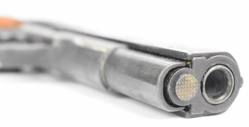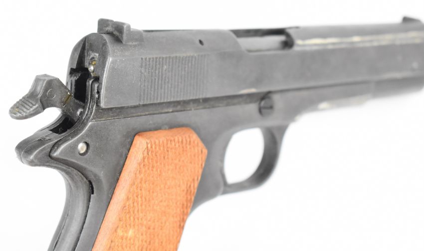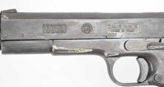 BBM Bruni 8mm blank firing pistol with chequered wooden grips and multi-shot magazine, NVSN
