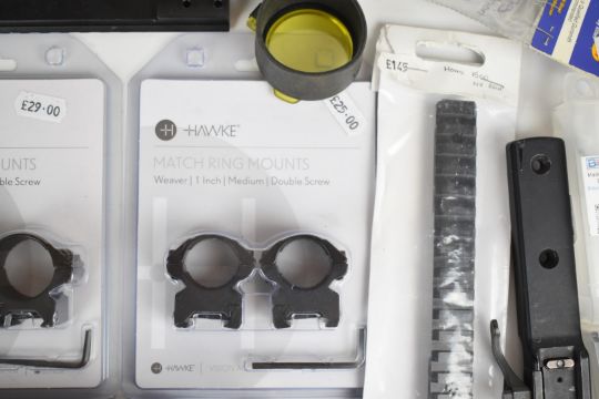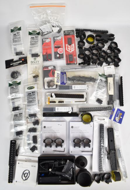 A collection of scope mounts and accessories including Armed Forces Laser Sight Module, Hawke Match Ring Mounts, Weaver Classic, Bergara 20 MOA Short Action scope rail etc, some in original boxes / packaging.