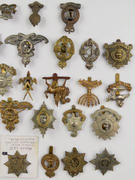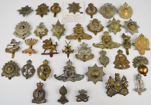 Thirty five British Army cap badges including 13th London Regiment, East Surrey, Royal Artillery Volunteers Worcestershire, Lancashire Volunteers, Scots Guards, Cheshire, Coldstream Guards and Irish Guards, some restrikes