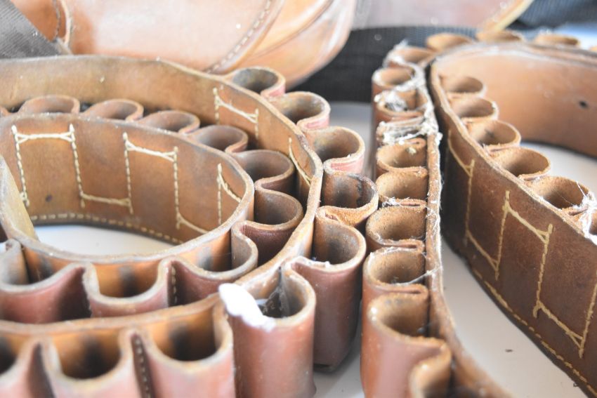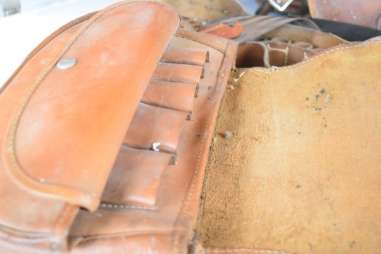 Six vintage brown leather shotgun cartridge bags and belts.