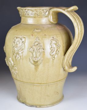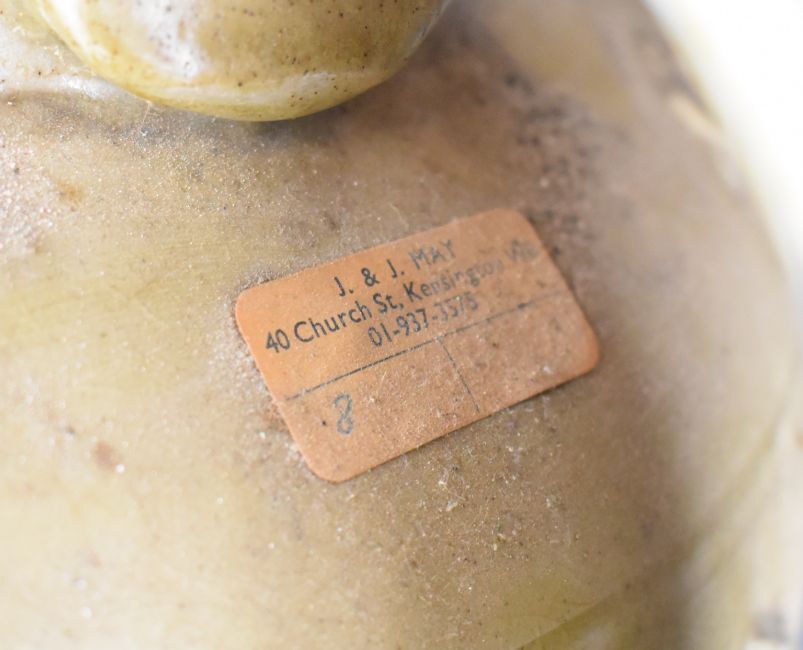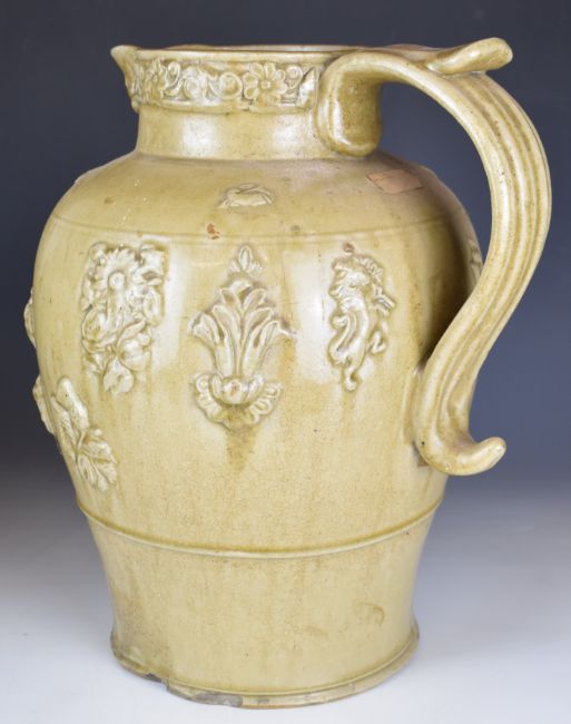 Large Victorian stoneware jug / pitcher with Royal coat of arms, probably commemorating the marriage of Queen Victoria and Prince Albert, with relief moulded coat of arms, flowers, animals, lion passant and unicorn with old J & J May, Kensington label to side