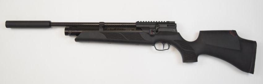 Weihrauch HW110 .177 PCP air rifle with composite stock textured semi-pistol grip and forend, raised cheek piece, adjustable trigger, scope rail, 10-shot magazine, carbon barrel sleeve and sound moderator, serial number 2112635, with original tag.
