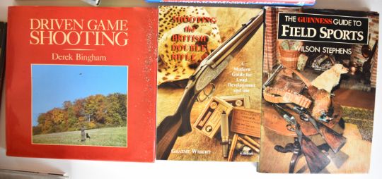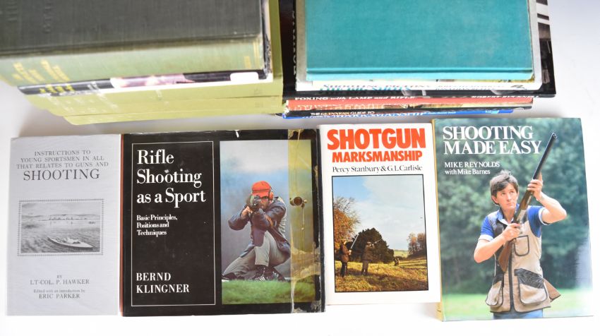 Twenty-two shooting related books including Experts on Guns and Shooting, The Complete Shot, Instructions to Young Sportsmen, Driven Game Shooting, A History of Marksmanship, The Complete Book of Shooting, The Guinness Guide to Field Sports, Shooting Made Easy, Shooting Pigeons, Shooting Woodpigeon, Rifle Shooting as a Sport etc.