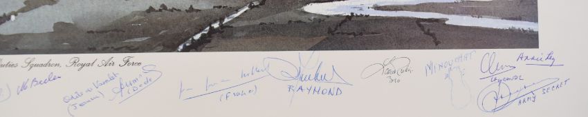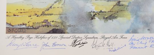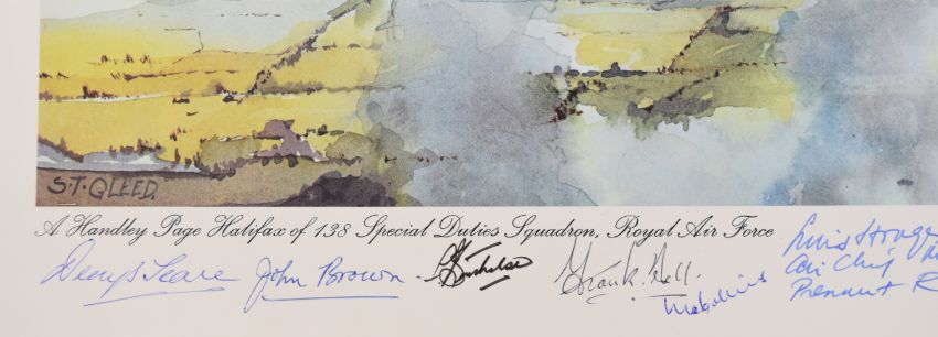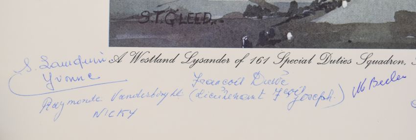 Royal Air Force WW2 Escaping Society and Cométe Escape Route interest, seven posters by St Gleed 'A Westland Lysander of 161 Special Duties Squadron, Royal Air Force' signed by thirteen members of Cométe who helped airmen evade the Germans, also two RAF Escaping Society posters 'Help Those Who Helped Us In Our Hour Of Need', 30 x 36cm