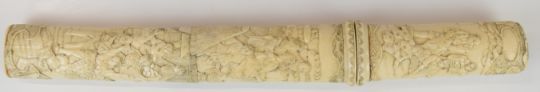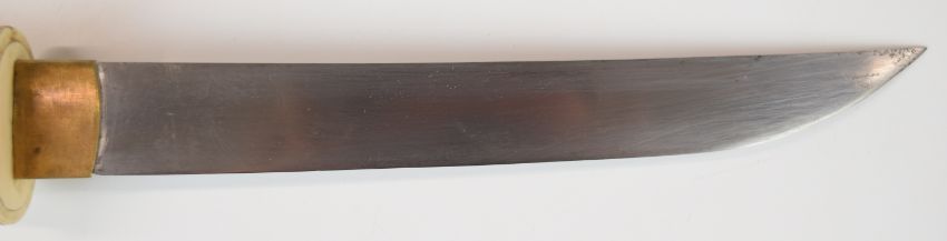 Japanese Meiji period Wakizashi Samurai sword with heavily carved bone handle and scabbard decorated with figural scenes and 21cm blade. PLEASE NOTE ALL BLADED ITEMS ARE SUBJECT TO OVER 18 CHECK ON COLLECTION OR DELIVERY