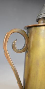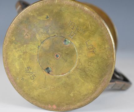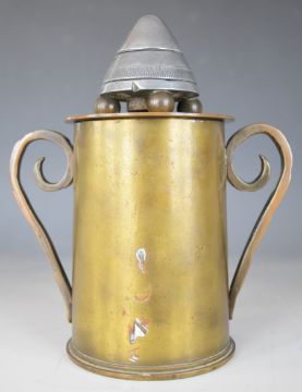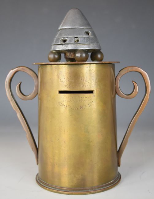 Gallipoli WW1 interest trench art money box, with timer finial and base made from a part shell case dated 5/15, inscribed around money slot Gallipoli 1915-16, Nada Davis born May 8th 1917, height 20cm
