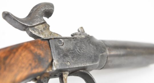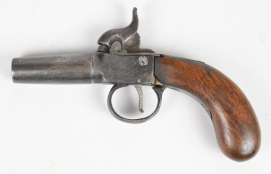 Unnamed percussion hammer action pocket pistol with engraved frame and trigger guard and 1.75 inch turn-off smooth bored barrel, overall length 16cm.