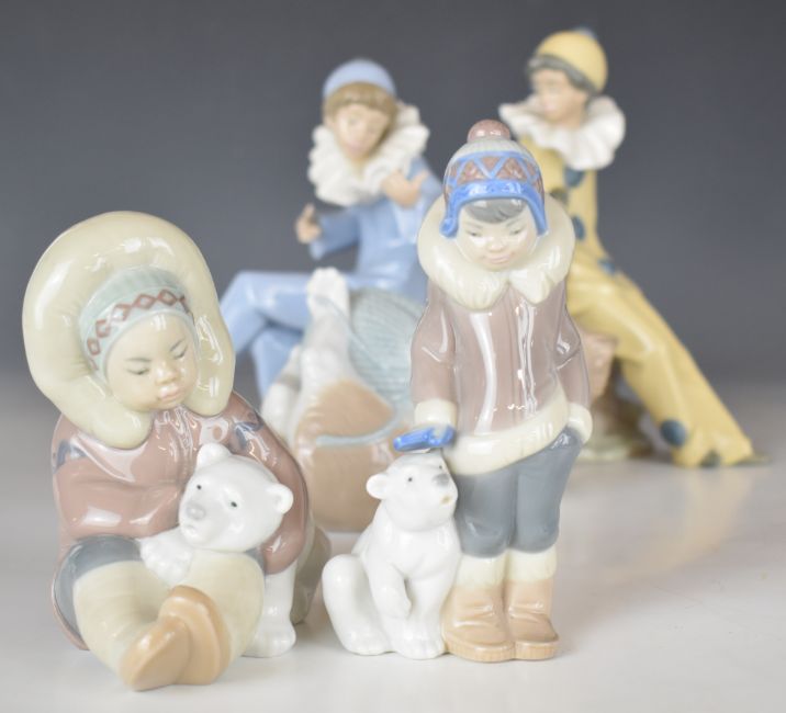 Five Lladro / Nao figures including Inuit and Pierrot, tallest 20cm