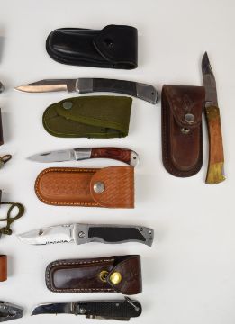 Ten folding / pocket knives including Marksman, Magnum by Boker, Blyde of Sheffield and Rostfrei, largest blade 9.5cm, all with pouches. PLEASE NOTE ALL BLADED ITEMS ARE SUBJECT TO OVER 18 CHECK ON COLLECTION OR DELIVERY