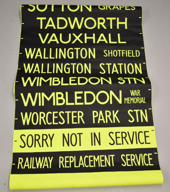 Bus destination blind for London including Wimbledon, Vauxhall and Redhill