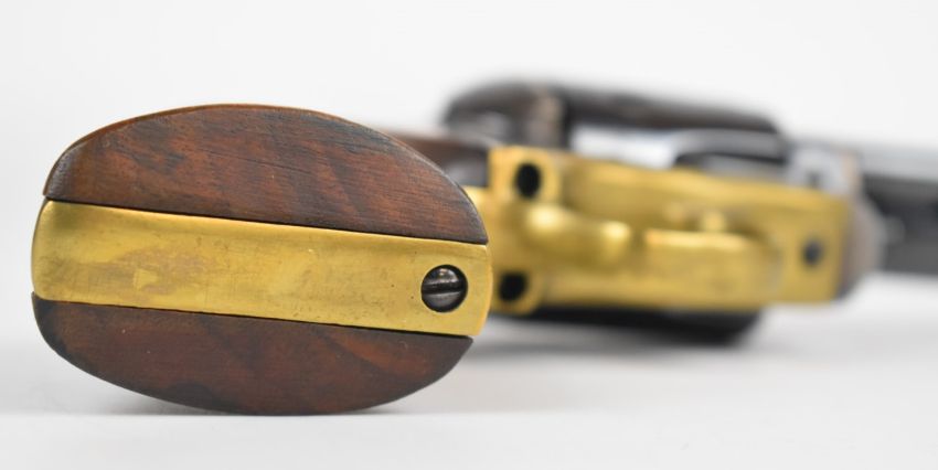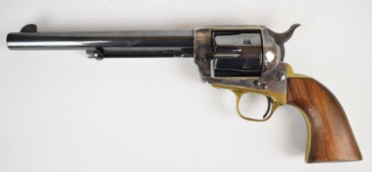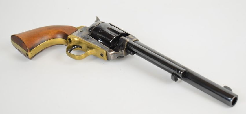 Henry Krank Colt Long Knife style six shot single action blank firing revolver with brass grip strap and trigger guard, shaped wooden grips and 7.5 inch barrel, overall length 35cm.